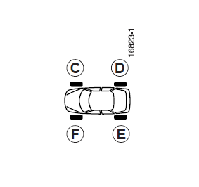 Das Rad B zeigt an, dass der Reifen des betreffenden Rads defekt ist oder einen viel zu geringen Reifendruck aufweist. Wechseln Sie das Rad oder verständigen Sie eine Vertragswerkstatt im Falle eines Reifenschadens.